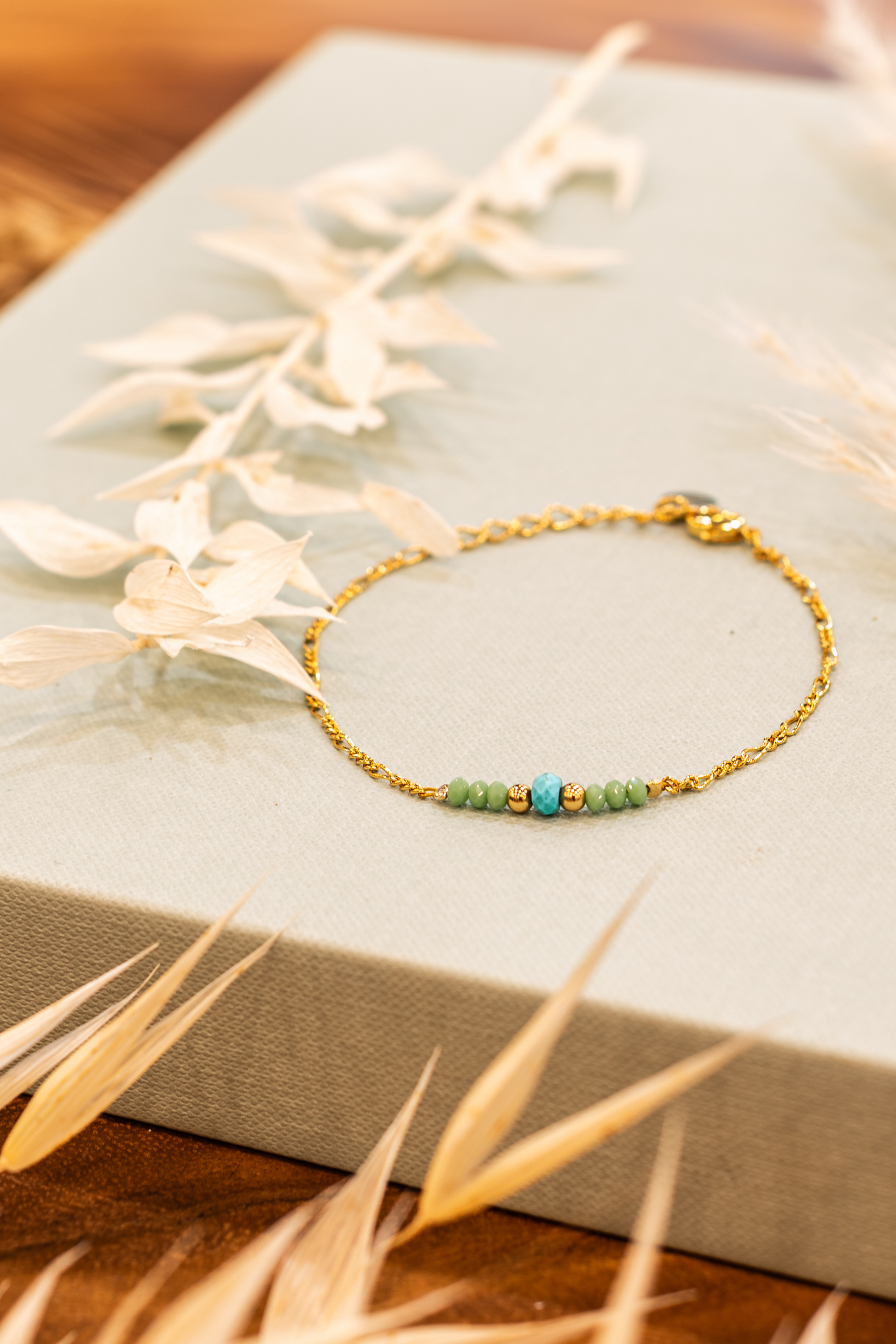 This adjustable bracelet is handmade in hypoallergenic brass, 16K gold plated with a special lacquer to preserve the material. Nickel and lead free. Adorned with natural stone and green or pink crystals.